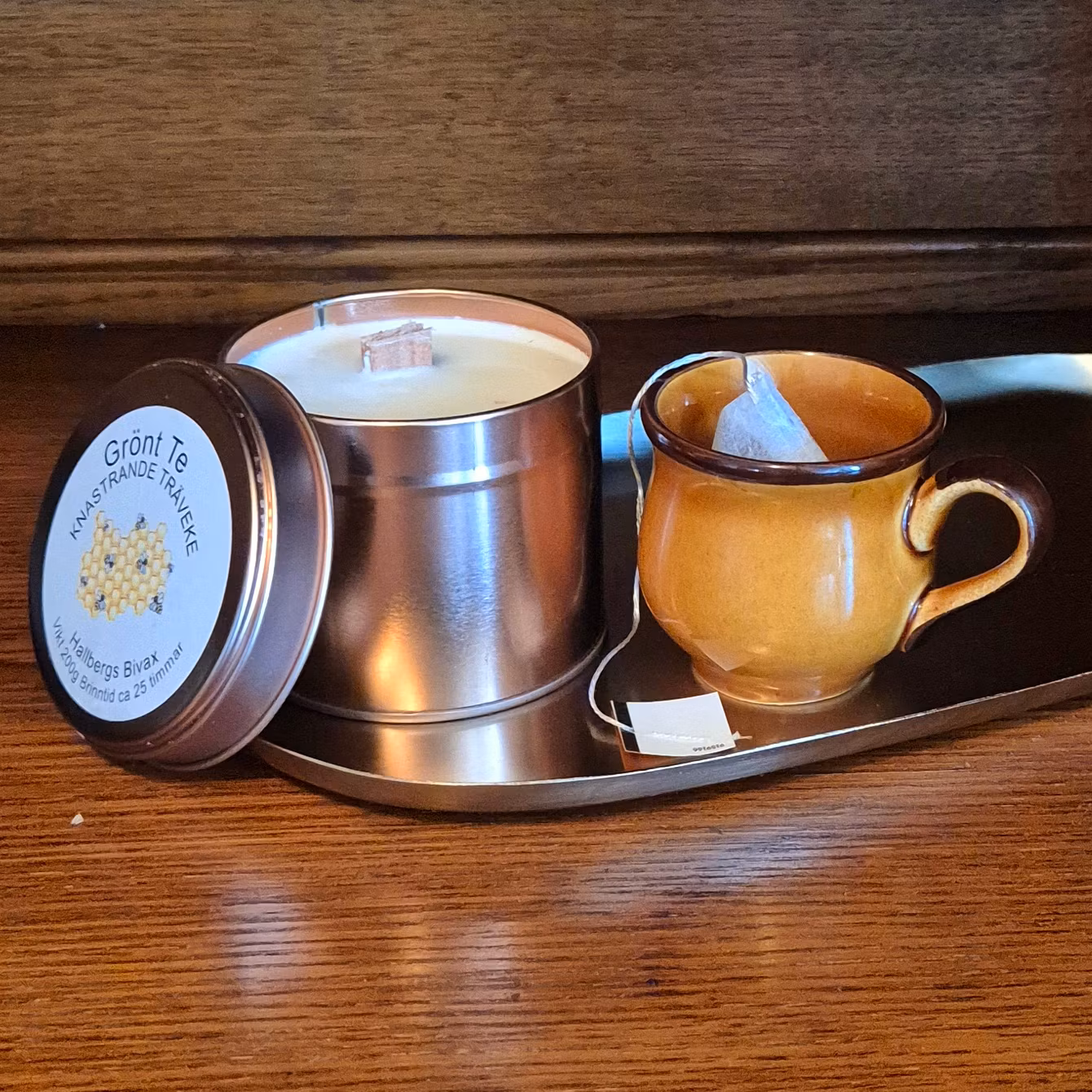Upplev lyxen av Grönt Te doftljus med knastrande träveke. Förgyll din vardag, 25h brinntid. Beställ nu på Hallbergs Bivax!