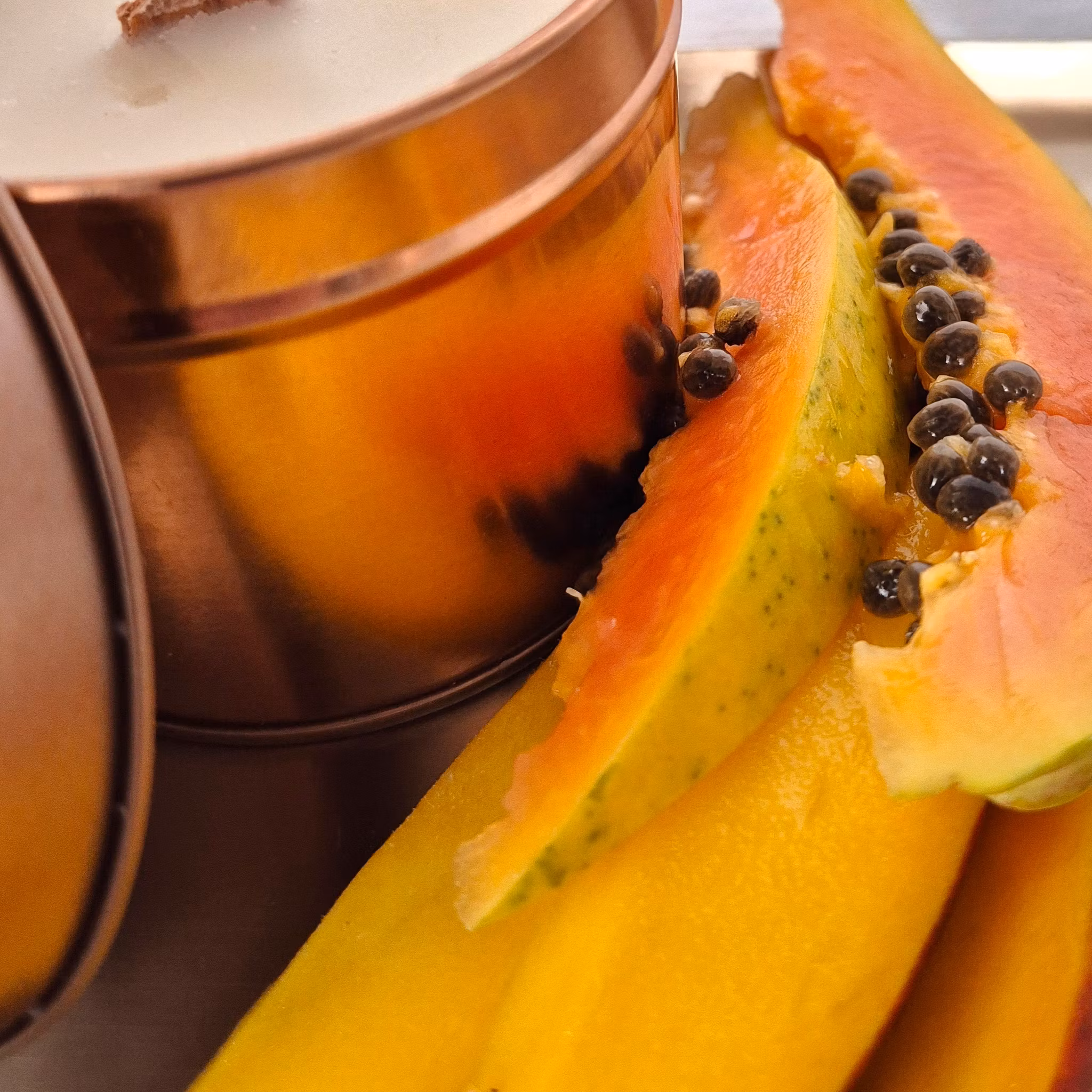 Mango & Papaya – en exotisk sommarkänsla fångad i ett ljus. Doften är en solmogen kombination av söt mango och färsk papaya som för tankarna till palmkantade stränder och blått hav.