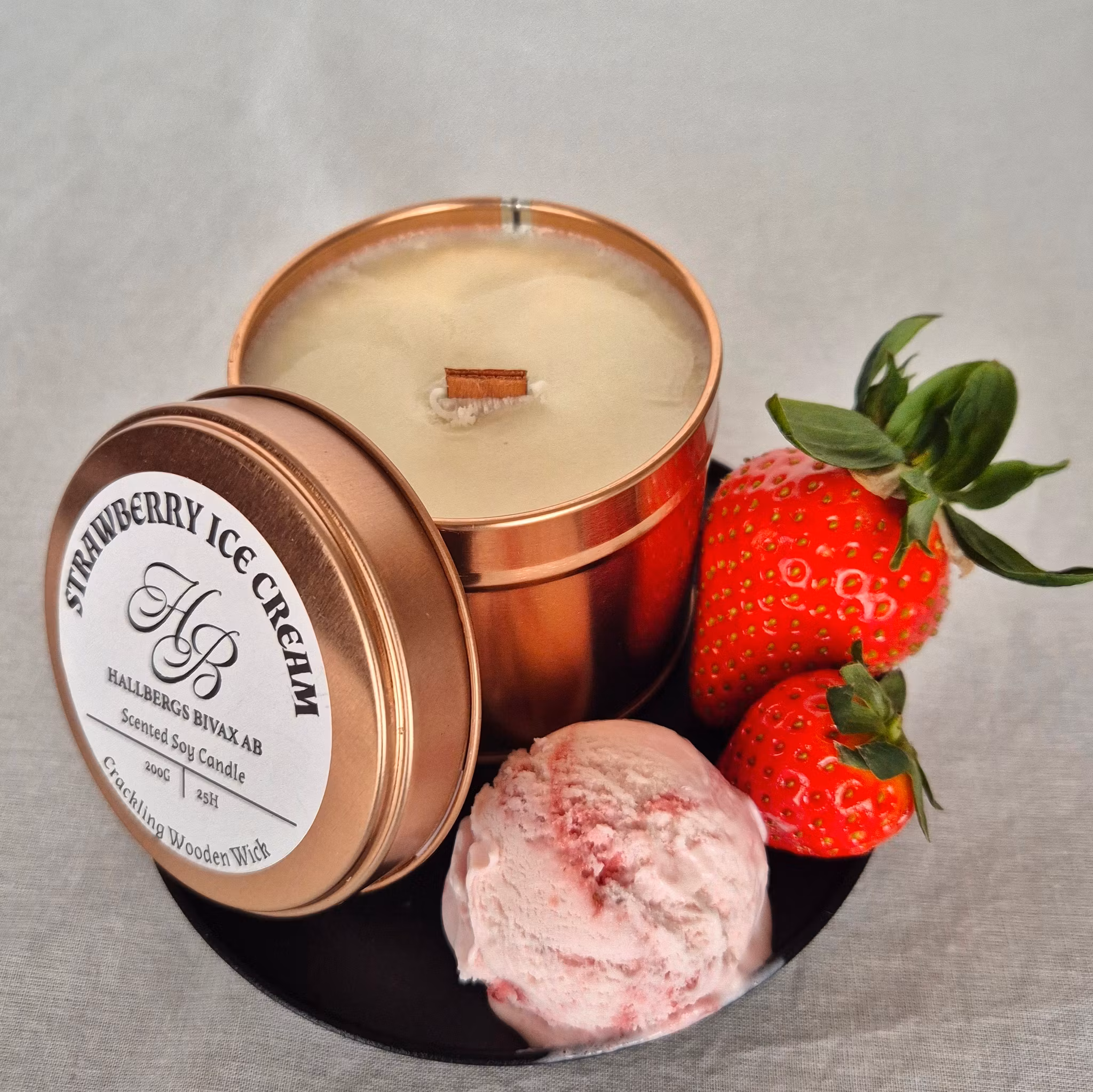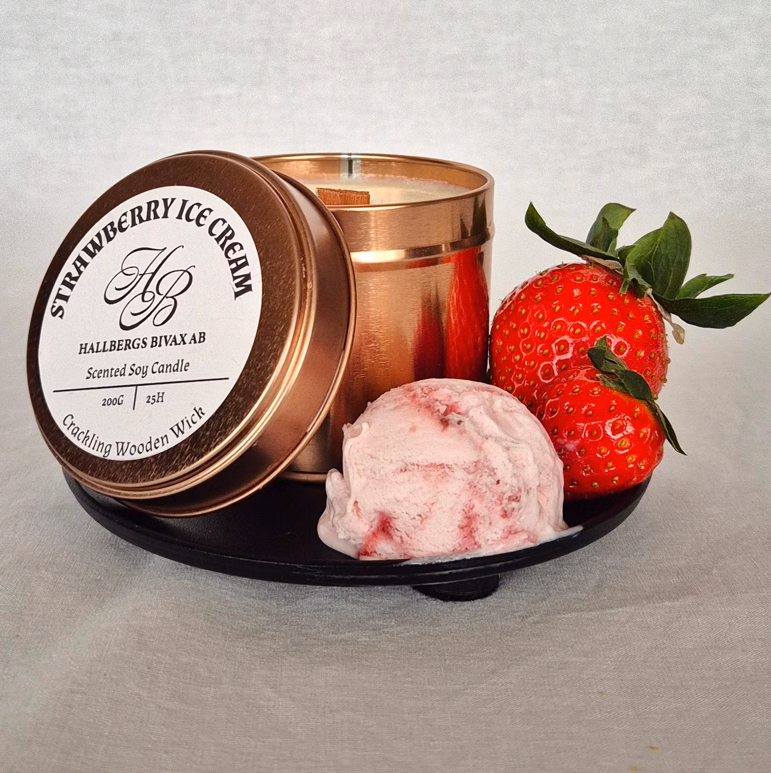 Strawberry Ice Cream är glad, mjuk och nostalgisk – som en sked jordgubbsglass en solig dag. Doften är bärig och söt med en krämig känsla som gör den varm och ombonad, inte bara “godis”. Ett ljus som gör rummet lite lättare, lite ljusare – perfekt när du vill ha en lekfull men fortfarande mjuk doft.